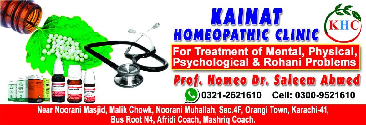 Kainat Homoeopathic Clinic is Dr. Saleem Ahmed’s renowned Clinic where all types of Physical, mental, spiritual, psychological ailments are treated with the help of homoeopathic treatments.
